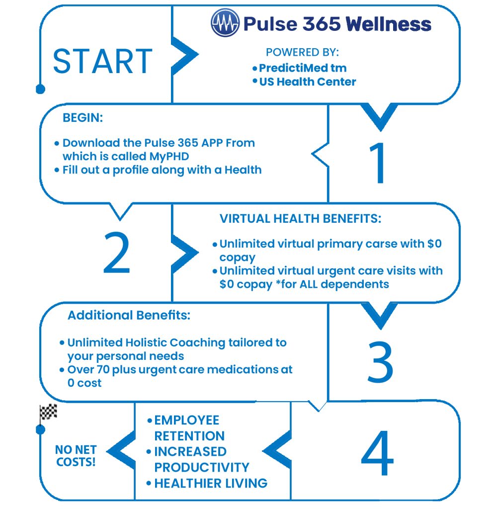 Pulse 365 Wellness is an application that drives a wellness program for employers which allows for additional employee benefits as well as a potential tax reduction. We can evaluate your company’s unique dynamics today with no hassle and no cost. The entire program is no net cost!